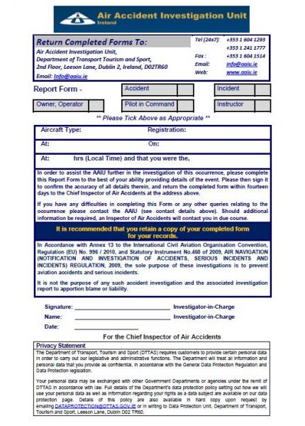 The notification is required to be passed to the AAIU by the quickest means and giving, as far as possible, the following information: